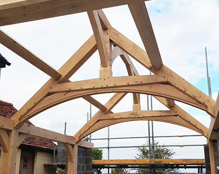 Oak roof frame for feature design in a new kitchen extension. With moulding to the bracing and main trusses.