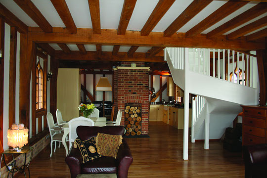 This building features a jettied first floor in keeping with other period properties in the area. We designed the frame to suit an open plan interior downstairs.