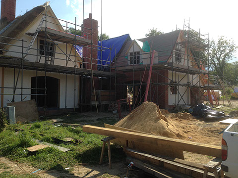 Total rebuild of a pretty Grade 2 Listed Lodge in Essex. This poor building had suffered from neglect, vandalism and arson. Owner employed architect to draw plans, around which Hobbans Timberworks designed and constructed the new frame in green oak. The result is an amazingly spacious 2 bedroom dwelling with a large open plan living area downstairs leading through to a large kitchen.