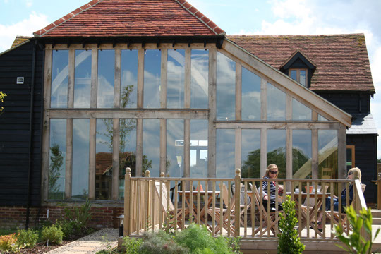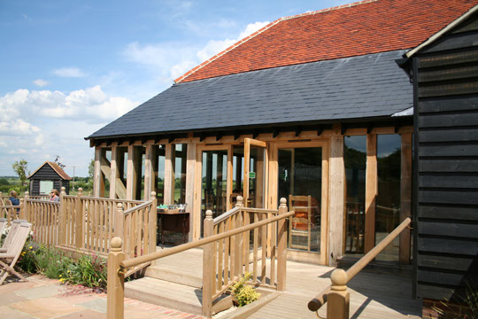 A large green oak extension to Hobbans Timberworks' original farm shop building. The half cruck frame is split over two levels providing upstairs and downstairs seating areas, all glazed to show through to the beautiful countryside beyond.
