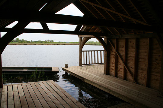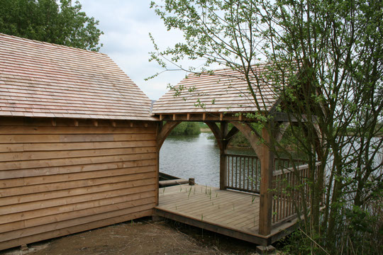 Oak framed boat house clad in maintenance free cedar feather edge board and a roof of cedar shingles. The adjoining covered deck area is perfect for summer picnics or reading by the water's edge. The oak and cedar will eventually turn silver and the building will melt into its environment, becoming part of the landscape.