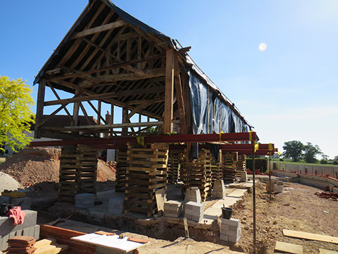 Renovation work begins on this old granary/maltings barn. We have jacked it up while the ground work is being put in place and then we can safely start on the timber repairs. It is supported on steels which will be utilised in the new additions to the barn, and timber cribbs which form part of the jacking and levelling process.